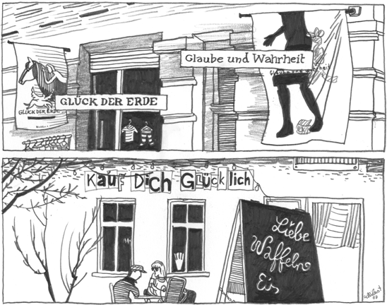 | Berlin / Prenzlauer Berg: Sinnstiftung beim Kauf von Gummistiefeln oder Kuchen. März 2007 Die Bildkolumne AUS DER GESELLSCHAFT erschien von 2001 bis 2007 in der Berliner Stadtzeitung Scheinschlag . Die Zeitung wurde im Sommer 2007 "abgewickelt", sie ruhe in Frieden. |