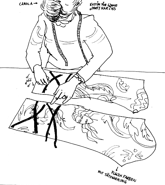 Der Intendant des Hauses hat auch eine Szene geschrieben, 'Party-Narziss' ... laßt uns tanzen, laßt uns lieben, Party Narziss, die Liebe genießen, das Leben genießen, Freunde der Nacht, eilt herbei, der Kummer von gestern vorbei ... Als die Szene zum ersten Mal im Kostüm geprobt wird, besucht er die Proben. Der Sänger dieses Parts - der Wesir - gesteht ihm: "Dieses Lied singe ich besonders gerne." |