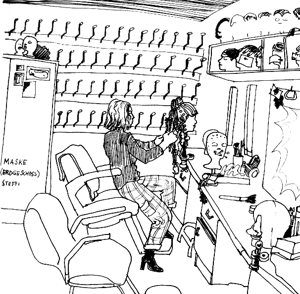 | Nachbesprechung der Probe zwischen Isabell und Regisseur: I „Nein, ich bin vollkommen fertig, ich kann nicht mehr." R „Isabell, du bist völlig aus der Rolle gefallen, vorhin, du mußt Kontakt mit Karim aufnehmen. Immer wenn du den Kopf verdrehen mußt, sagtst du, du bist nicht zu sehen! I „Aber ich stehe vorne und Karim hinten, wie soll ich da mit ihm Kontakt aufnehmen? Ich kann doch nicht nach hinten spielen? Karim muß nach vorne spielen!" R „Ja, frag aber mal den großen Schauspiellehrer danach ..." I „Nein danke, ich habe selber Schauspielunterricht genossen." R „Isabell, immer wenn du in Pose bist, vergisst du vollkommen, daß du noch eine Rolle zu spielen hast!" |