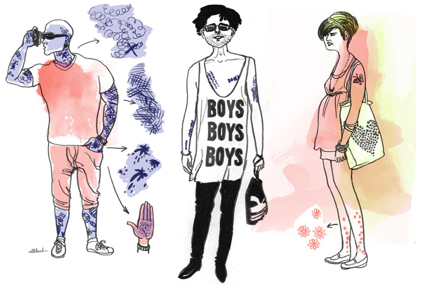 Fashionvictims / Modeopfer 023 Tattoos are only good for distinction, when they are applied as extensively as possible. The hipster is showing off his self-mutilation, neck, hands and face are no longer a taboo. The lines of the patterns mimic every scar that a fashion-conscious cutter achieves with a cheap razorblade. Tätowierungen taugen nur mehr zur Distinktion, wenn sie möglichst großflächig aufgebracht werden. Der Hipster kokettiert mit seiner Selbstverstümmelung, Hals, Hände und Gesicht sind schon lange kein Tabu mehr. Die Linienmuster auf seinen Armen imitieren jene Narben, das sich modebewußte Ritzerinnen mit dem Rasiermesser billig selbst besorgen.