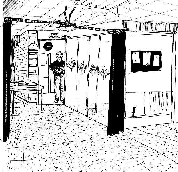 Tute, der Pförtner ist seit 26 Jahren am Friedrichstadtpalast beschäftigt. Er ist stolz darauf, in all diesen Jahren keine einzige Vorstellung besucht zu haben "interessiert mich nicht. Ich war noch nie neugierig, schon als Säugling nicht." Ihn begeistert, daß er in 46 Tagen in Rente geht. Vorsorglich hat er 46 Kaffeefilter durchnummeriert und verbraucht davon jeden Tag genau einen. Die Wende hat Tute auch nicht sehr interessiert (Nachtrag: Ein halbes Jahr nachdem er seinen letzten Kaffeefilter verbraucht hatte, ist Tute Lehmann in seinem Wohnzimmer tot umgefallen. Einfach so.) |